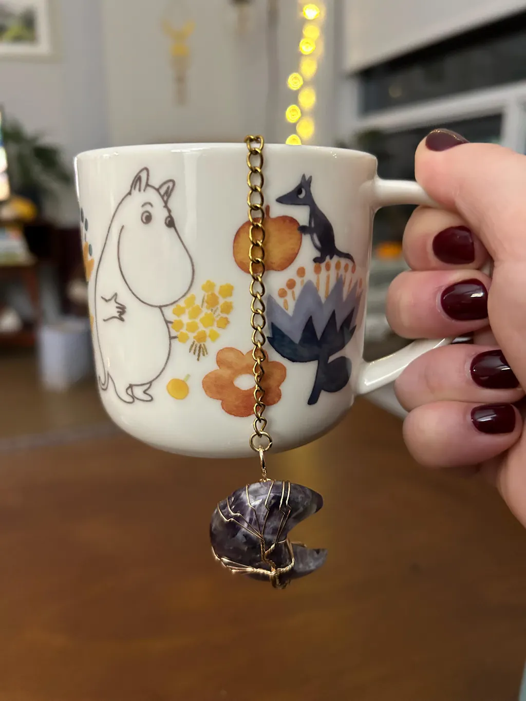 Gold Wire-Wrapped Moon Gemstone Tea Ball Infuser - Crescent moon shaped crystal stone wire-wrapped with copper colored Tree of Life